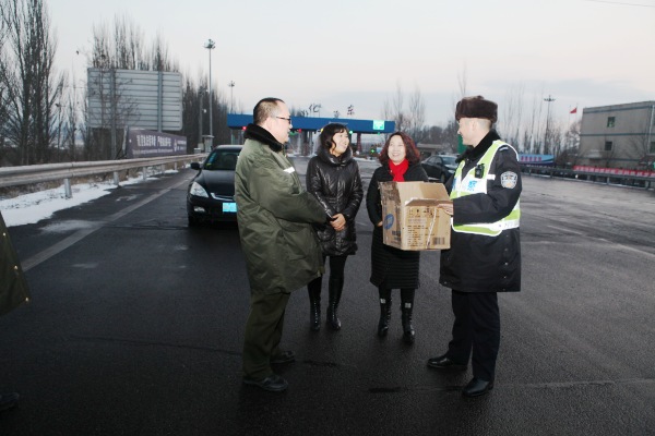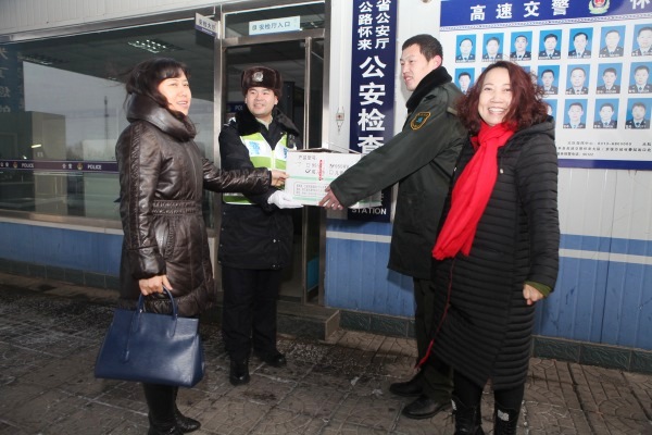 在京張高速公路冀京界懷來和宣化東公安檢查站,張慧敏一行與正在一線執(zhí)勤的交警一一握手慰問,對(duì)辛勤工作的交警表示誠(chéng)摯的問候?倳(huì)計(jì)師張慧敏說,在這種能見度低、污染嚴(yán)重的霧霾和降雪的惡劣天氣條件下,交警同志不惜犧牲自己的健康,用堅(jiān)守和執(zhí)著保障過往司乘人員的出行安全和道路暢通,用辛勤汗水和艱苦付出維護(hù)了京張高速公路的道路交通秩序,交警同志們辛苦了。長(zhǎng)期以來,京張公司與高速交警懷來、宣化大隊(duì)保持友好關(guān)系并結(jié)下深厚友誼。為此向辛苦工作在一線的交警同志送來問候,對(duì)一線交警恪盡職守、無私奉獻(xiàn)的精神表示由衷的敬意。