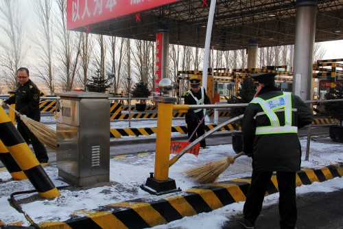 1月18日宣化東收費(fèi)站根據(jù)雪情及時(shí)啟動(dòng)應(yīng)急預(yù)案,在交警配合下做好除雪保暢工作。