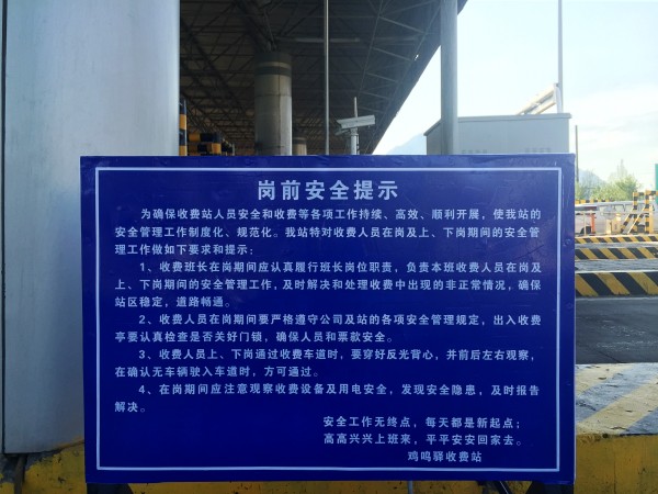 雞鳴驛收費站制作崗前安全提示牌提醒上崗人員安全作業(yè)