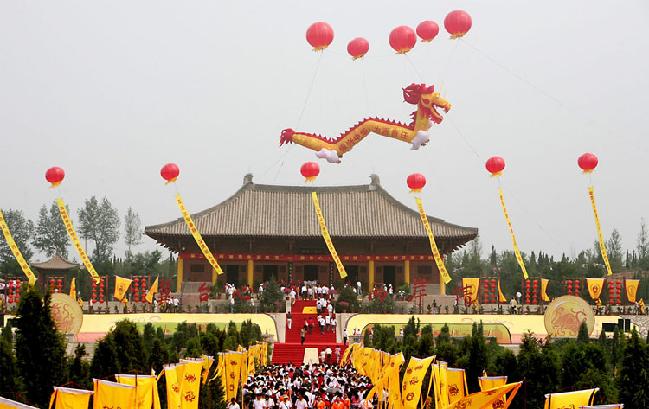 圖片說明:由海外華人捐資興建的中華三祖堂,位于軒轅湖以東,黃帝泉北200處,是中國黃帝城文化旅游區(qū)的中心景點。三祖堂是一座仿唐建筑,重檐飛角,恢弘壯闊,全部木質(zhì)結(jié)構(gòu)。全堂占地104畝,由平面祭壇、三祖堂、后殿組成。殿內(nèi)三位祖先的塑像姿態(tài)各異栩栩如生,居中的黃帝氣宇軒昂,右側(cè)的炎帝睿智儒雅,左側(cè)的蚩尤勇武彪悍,塑像高6全部由泥土塑成。大殿四壁繪有涿鹿之戰(zhàn)、阪泉之戰(zhàn)、合符釜山、定都涿鹿四大歷史事件的大型壁畫。