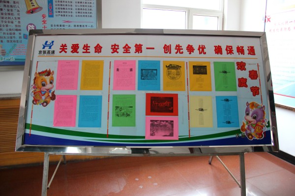 1月24日,沙城收費(fèi)站專門更換了一期“年味”十足的宣傳展板,喜迎2014年春節(jié)到來(lái)。展板內(nèi)容涵蓋了春節(jié)期間掃塵、貼春聯(lián)、守歲、放爆竹、拜年、給壓歲錢等習(xí)俗的由來(lái),以及賀新年詩(shī)詞等內(nèi)容,在喜氣洋洋、年味十足的氣氛中喜迎春節(jié)的到來(lái)。由一對(duì)“福馬”為全體職工送上新年的祝福,祝大家馬年大吉,工作順利,平安吉祥,萬(wàn)事如意,并預(yù)祝2014年度的各項(xiàng)工作紅紅火火、蒸蒸日上。(沙城收費(fèi)站 高麗贇)