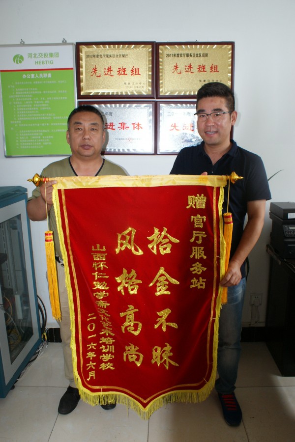 6月28日中午,郭書萍等隨行3位同志為服務(wù)區(qū)送來一面錦旗,對服務(wù)區(qū)員工拾金不昧的精神大大贊揚(yáng),并表示十分感謝。“拾金不昧,風(fēng)格高尚”幾個(gè)閃閃的金字格外耀眼,這既代表了失主對衣物失而復(fù)得的感激,也代表了對我們服務(wù)區(qū)工作的肯定,在今后的工作中,官廳服務(wù)區(qū)全體員工會(huì)一如繼往的努力,將各項(xiàng)服務(wù)工作做的更好,為社會(huì)公眾提供更好的服務(wù)環(huán)境。ü購d服務(wù)區(qū) 張鶴)