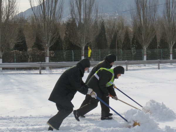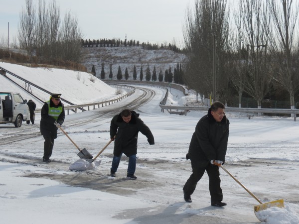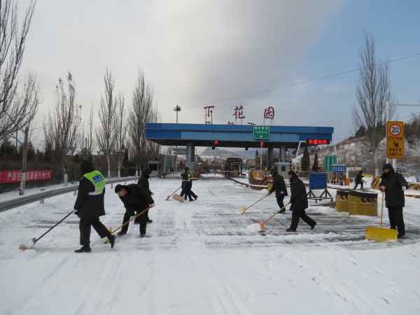 11月20日夜間,張家口地區(qū)入冬后的第一場(chǎng)大范圍降雪悄然而至,氣溫驟降,泥濘濕滑的路面給除雪保暢工作帶來(lái)嚴(yán)峻考驗(yàn)。雪情就是命令,21日一早下花園收費(fèi)站立即啟動(dòng)除雪保暢預(yù)案,職工們?cè)谥蛋嗾鹃L(zhǎng)的帶領(lǐng)下迅速投入到緊張的除雪保暢工作中。為及時(shí)消除積雪對(duì)道路通行帶來(lái)的不利影響,職工們頂著刺骨的寒風(fēng),不斷地?fù)]舞著手中的鐵鍬、掃把、推雪板,卯足干勁,力爭(zhēng)在最短的時(shí)間內(nèi)完成除雪保暢任務(wù)。與此同時(shí),為保障廣大司乘的安全出行,該站在站口醒目位置設(shè)立警示標(biāo)志,收費(fèi)站工作人員耐心提醒每一位司機(jī)朋友注意行車安全。經(jīng)過(guò)大家近三個(gè)小時(shí)的不懈努力,十一點(diǎn),收費(fèi)廣場(chǎng)及車道內(nèi)積雪全部清理完畢,圓滿完成了本次除雪保暢任務(wù)。以實(shí)際行動(dòng)展現(xiàn)了一支勇于擔(dān)當(dāng),拼搏實(shí)干的收費(fèi)隊(duì)伍。(下花園收費(fèi)站 耿海亮)