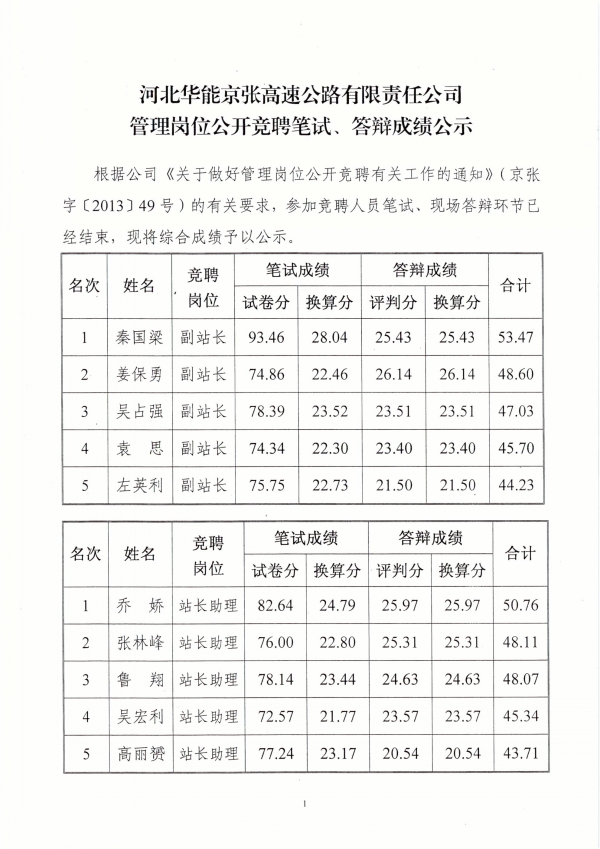 管理崗位公開競聘筆試、答辯成績公示