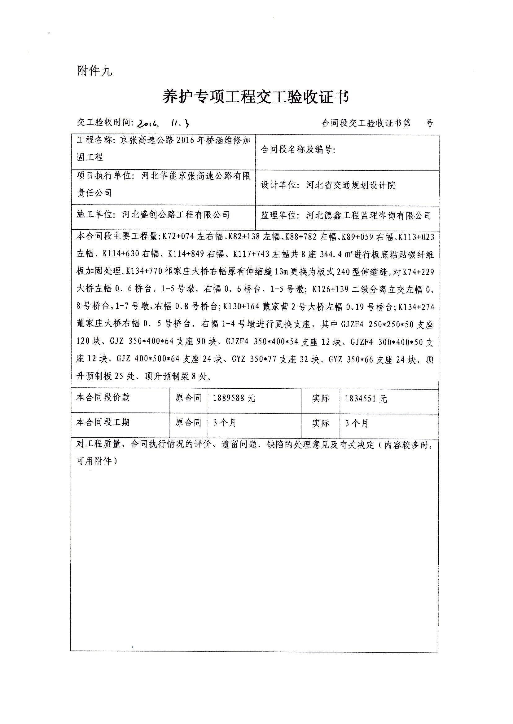 京張高速公路2016年橋涵維修加固工程交工驗(yàn)收證書(shū)