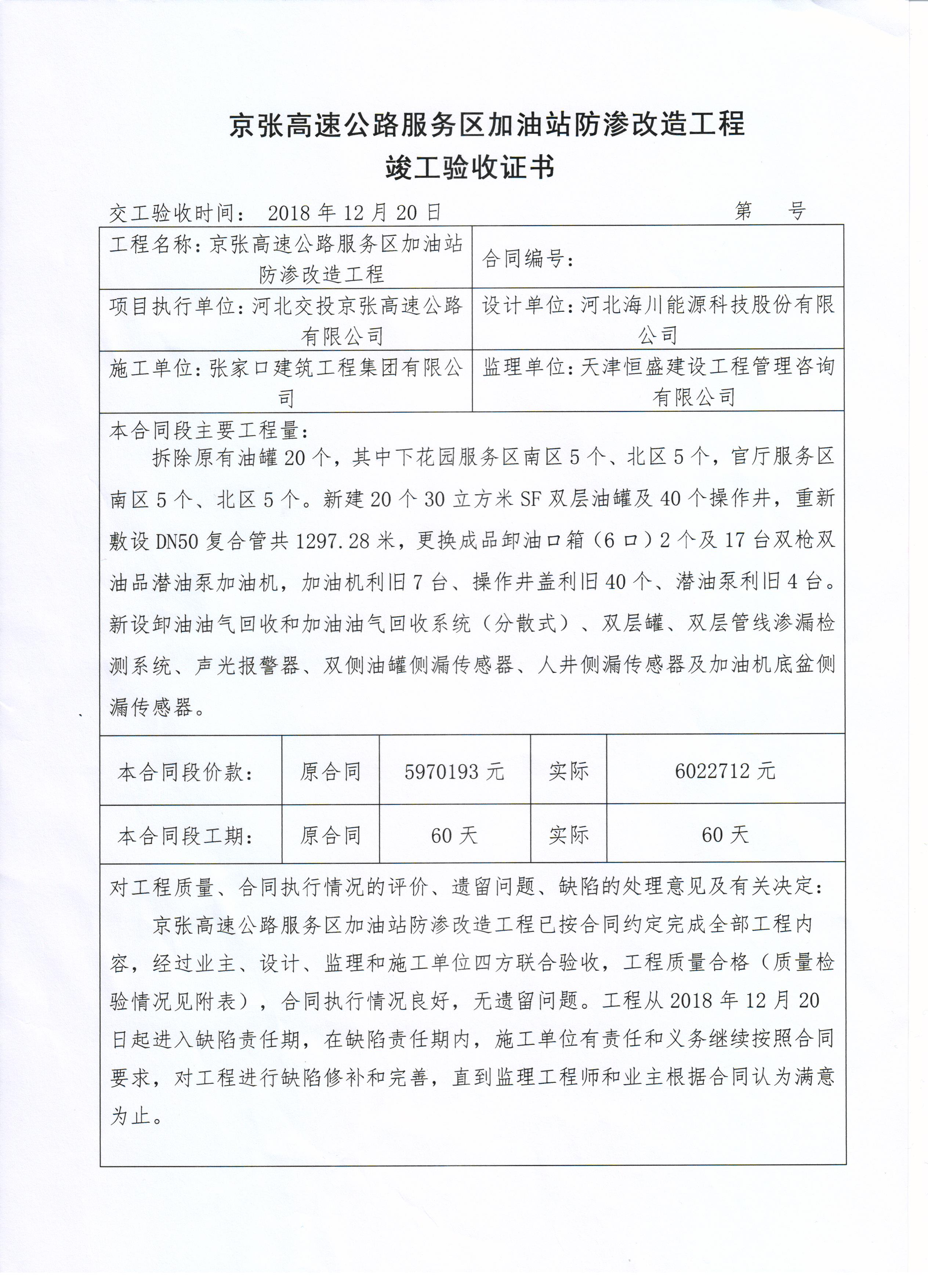 京張高速公路服務(wù)區(qū)加油站防滲改造工程竣工驗收證書